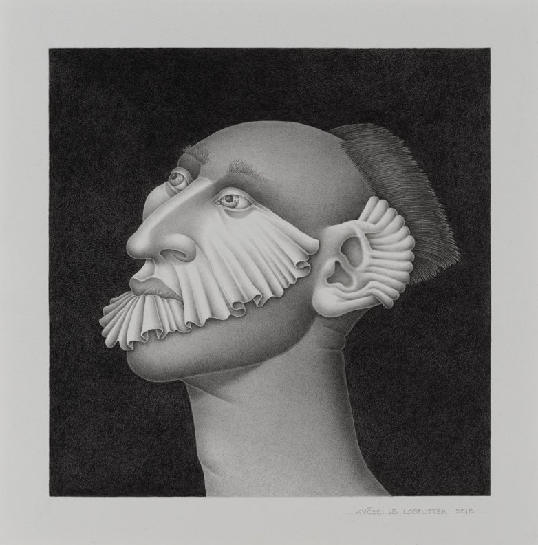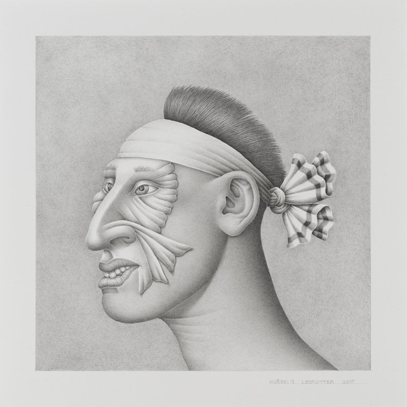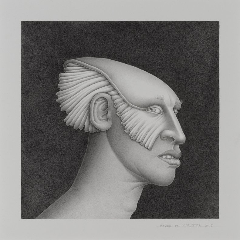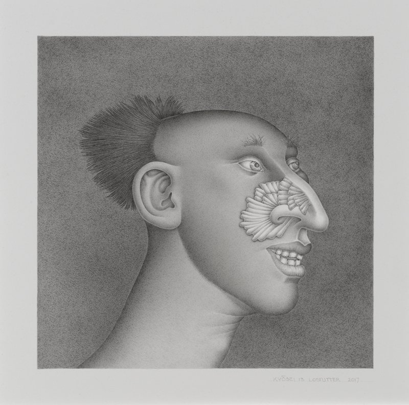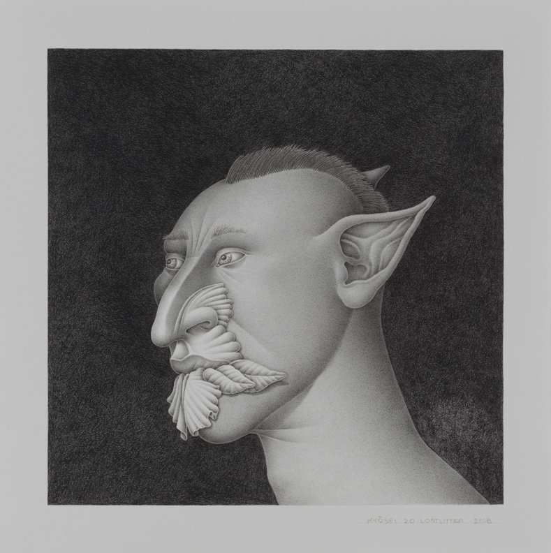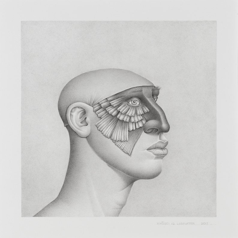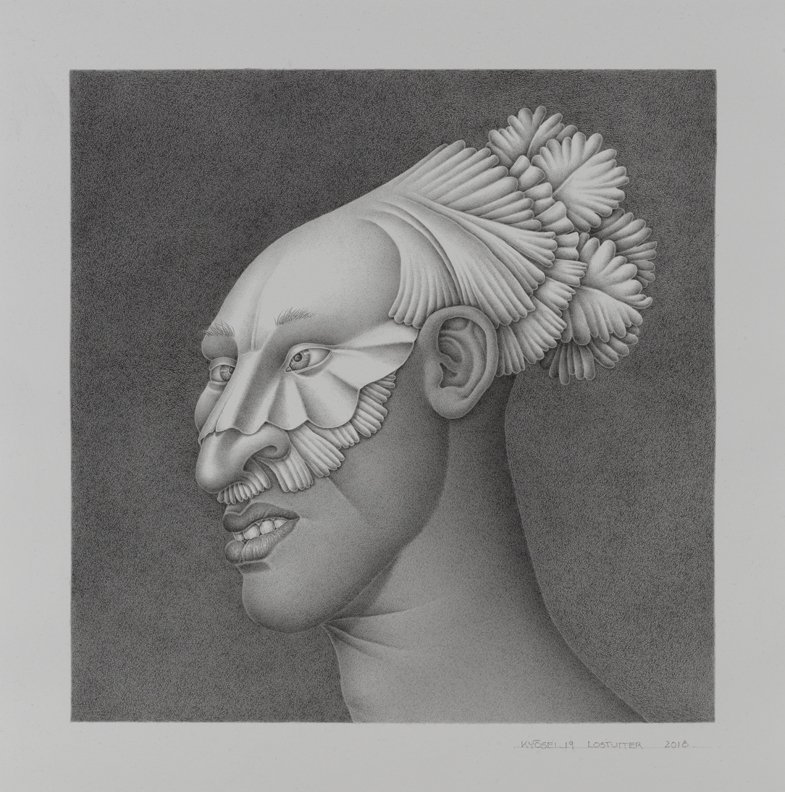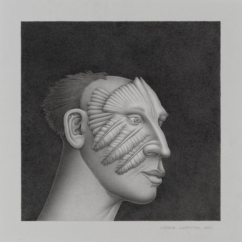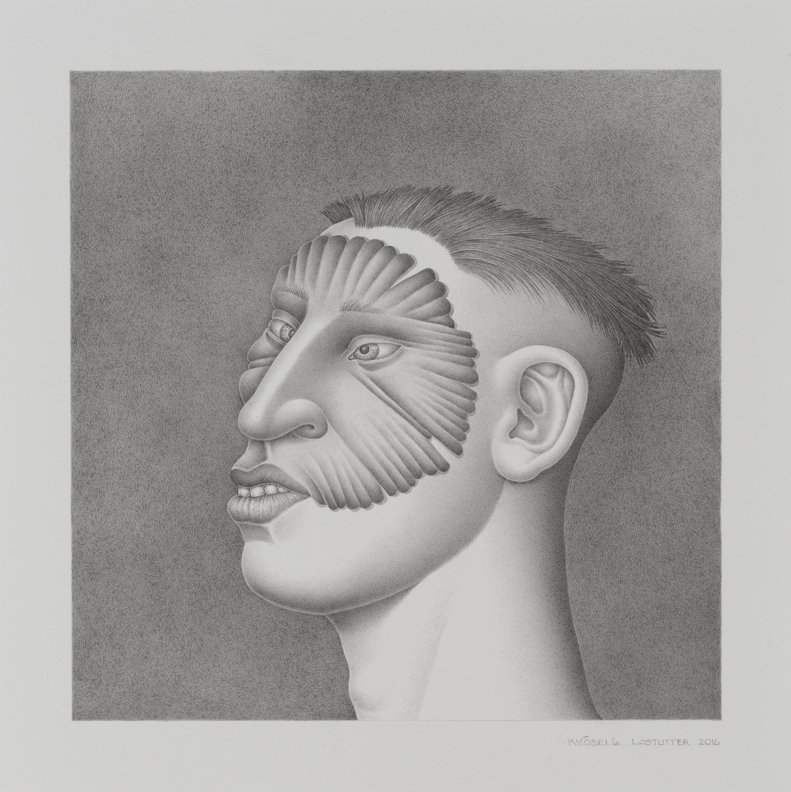 Robert Lostutter is in no way capricious. He does not move wistfully from thing to thing, but instead burrows deeply into an image or idea, excavating any available variation – a different angle, a change in gradient, an untried value – thereby demonstrating the importance of details, the high-stakes game of taking nuance seriously. Working on one of his masterful drawings, he’ll make nearly undetectable shifts by revisiting areas, adjusting lights and darks, buffing and honing the leadwork into a kind of ultimate existence. Graphite has been central to Lostutter’s practice since he began in the early 1960s, at times serving as an ideal medium for sketches, but just as often leading to terminal works on paper and even the rarely-seen format of pencil on canvas. In recent years, he’s been committed to the investigation of gray-scale portraits, including ones of increasing ambition in scale and resolution. In the works for Kyōsei , he’s explored both ends of lightness and darkness, creating several portraits that nearly evaporate into their ground and several with a rich, shadowy gunpowder tone that’s as velveteen and sumptuous as it is difficult to execute. The imagery is a continuation of Lostutter’s invented tribe of fantastic, harlequinade men – part human, part bird, part flower. Like John Graham’s mystical cross-eyed women, Lostutter’s bare-chested flock of floral fellows are psychologically loaded, projecting a complex interior thought space, a luminous penumbral membrane between day and night, persona and atmosphere. “Morning begins to brush the sky,” writes Lostutter in the poem that gives the show its title. “The day wolf chases the jackrabbit down/Sunset slope/Tender night/Suddenly I find the sweetest hours/ Midnight light/ Midnight floor/This is the ghost that I leave behind.”