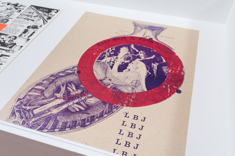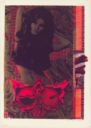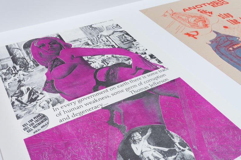 William Weege (b. 1935) is a legendary figure in American printmaking. He taught at University of Wisconsin, Madison, from 1971 to 1998, during which time he founded the Jones Road Print Shop and Stable of Barneveld, Wisconsin, where he collaborated with many important artists, most extensively Alan Shields and Sam Gilliam (the latter of whom he continues to work with today); in 1987, Weege went on to found Tandem Press. Weege was responsible for bringing photographic methods into printmaking at UW, and at the time starting in the mid-’60s he was very active making collage-based prints, most of them of a bold and provocative political nature, often using highly experimental means. The best known of these was a 25-piece portfolio titled Peace is Patriotic , from 1967, which utilized a range of different papers and combinations of serigraphy and offset printing. At the time, eight images from the portfolio were licensed by a poster company, which ultimately disseminated them as posters to all corners of the American anti-war, underground, and counterculture; any good hippy household had one of them on its wall. Comprised of Dada-like collages, incorporating text and images from popular culture, some of it graphically sexual or violent or medical, the portfolio included one print titled “Impeach Johnson,” which Weege repurposed three years later, its text altered to read “Impeach Nixon,” when he participated in the Smithsonian’s “Experimental Printmaking Workshop” at the notorious 1970 Venice Biennale. Weege stood outside the American pavilion printing and handing out the piece. In the late ’60s, Weege’s work was shown frequently in Chicago, including solo shows at Richard Gray Gallery, where he had a solo exhibition during the 1968 Democratic National Convention, and a presentation of his enormous 16-panel work “Long Live Life” in the same year at the Museum of Contemporary Art. Weege’s political and social commentary printworks are bodacious and aggressive, deploying fluorescent colors and complex layers of photographic image – sometimes borrowed, sometimes shot – and involving unconventional techniques like flocking, glittering, and sewing. In this, the first substantial roundup of works from 1967-1971, CvsD will show the Peace is Patriotic portfolio, along with two large multi-panel works, and a selection of other ambitious prints from the period. In conjunction with the show, CvsD has produced a 124-page book exhaustively reproducing Weege’s social and political printworks up to 1978, as well as related collages and an illustrated conversation with the artist about the work.